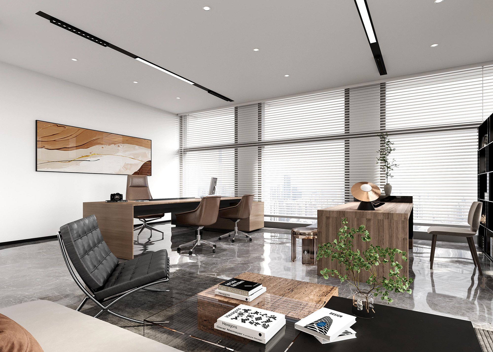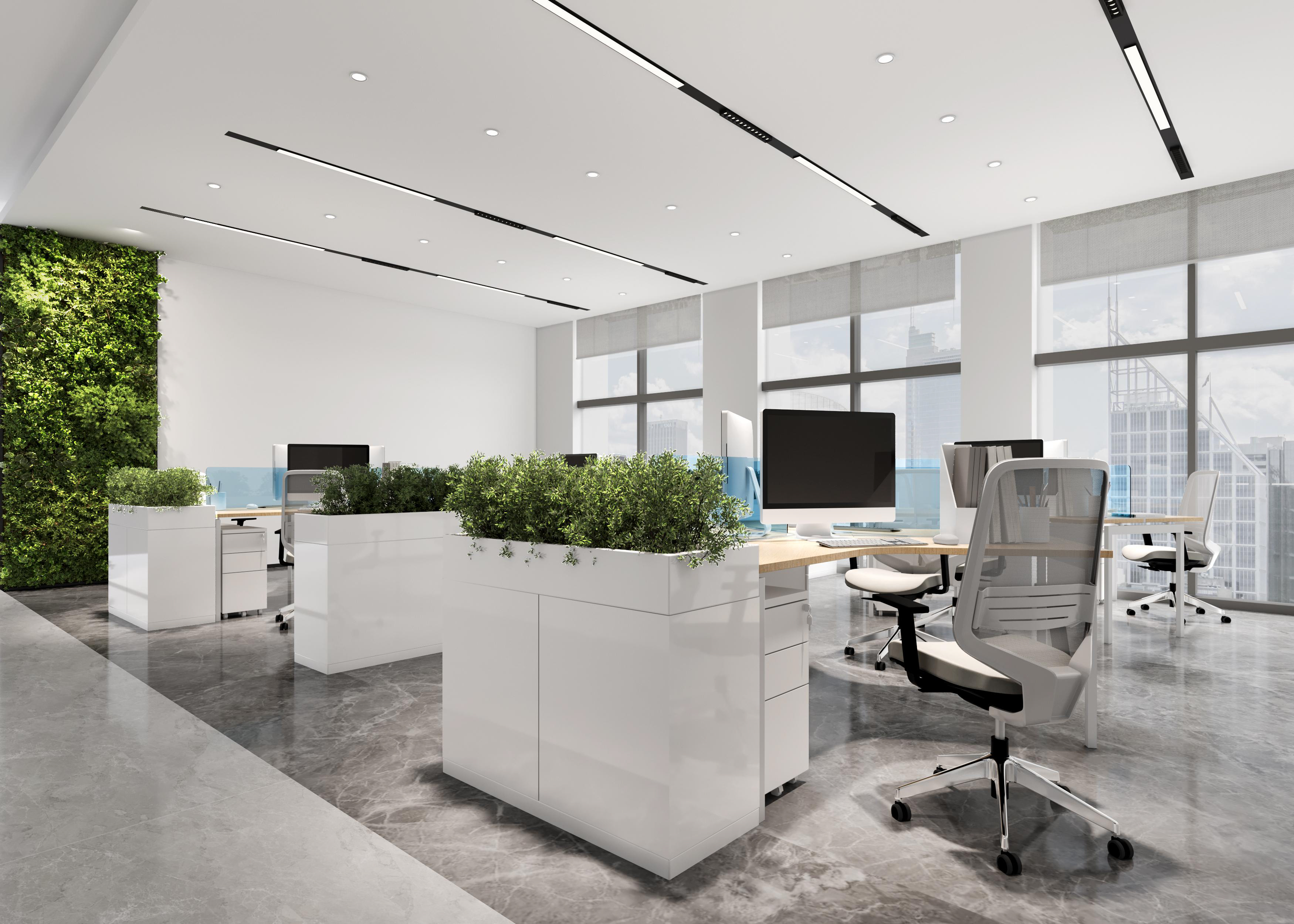 冷色為主色調,營造簡約、現代感,光點增加動態感,增添活力。隱藏式照明,減少視覺上的雜亂,空間看起來更加簡潔。開放式辦公室,使空間開闊,玻璃隔斷,增加了辦公空間的通透、明亮。