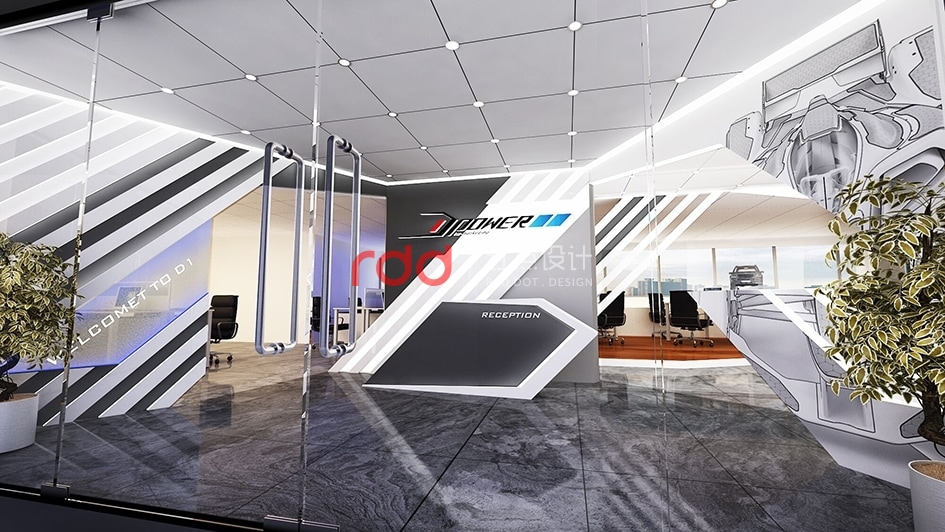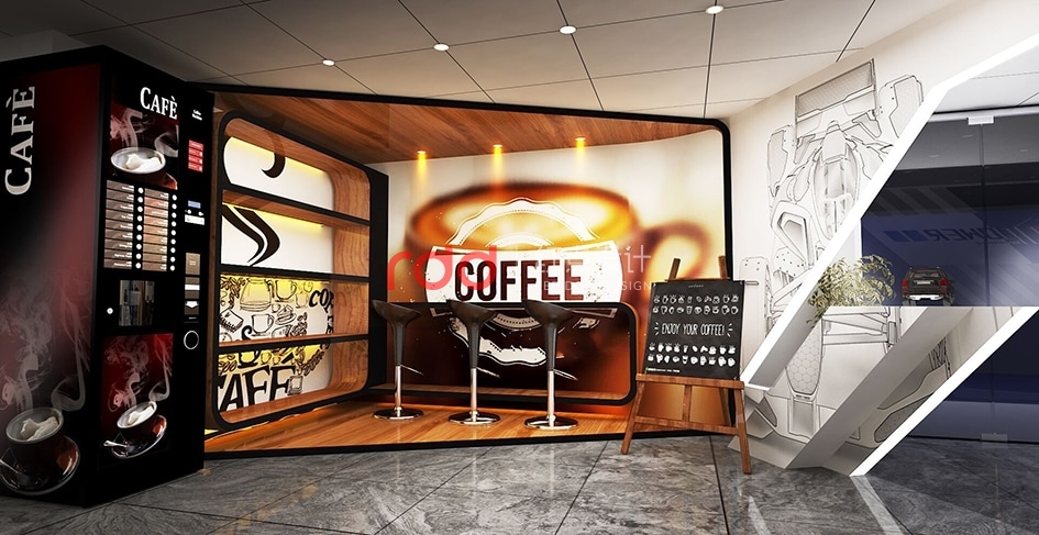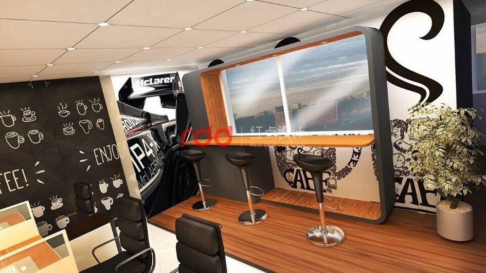 對于不同性質(zhì)功能的空間,設(shè)計師以不同的主題場景為設(shè)計點,例如前臺區(qū)域以灰色為基調(diào),通過深淺不一的灰色及線條硬朗的造型前臺,配上墻面賽車圖案,整個環(huán)境充斥著強(qiáng)烈的機(jī)械感及線條感。在咖啡的休閑區(qū)以咖啡為主題,原木飾面從地面一直延伸到天花,配上沉穩(wěn)的黑色及咖啡圖案,做舊的黑板點餐牌,咖啡吧的感覺就活隱活現(xiàn)。