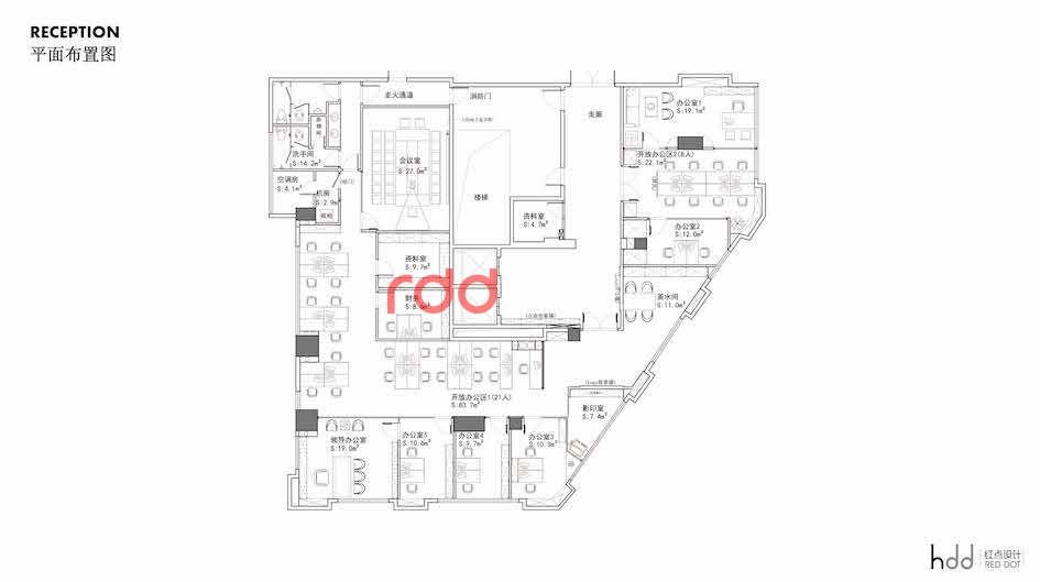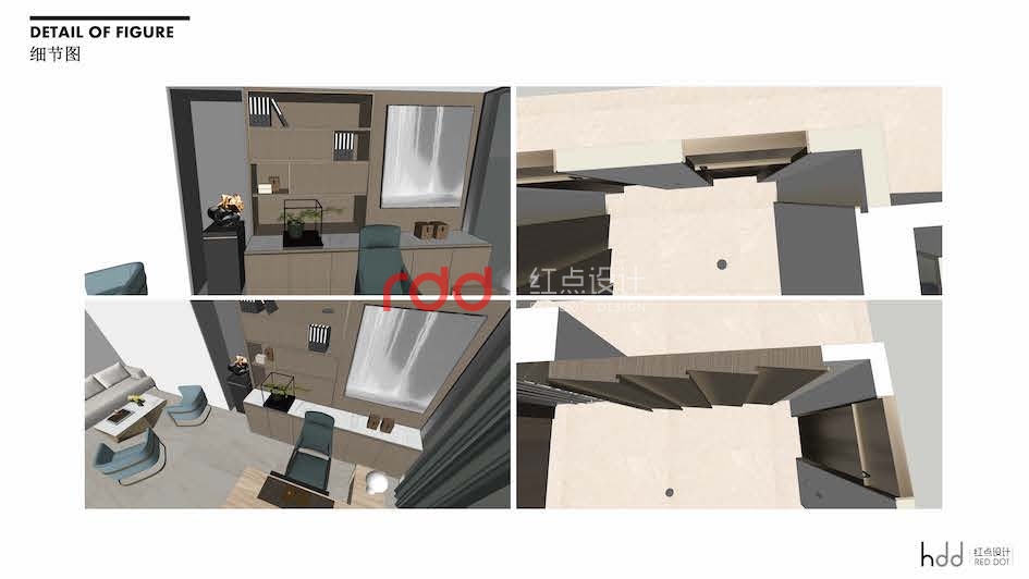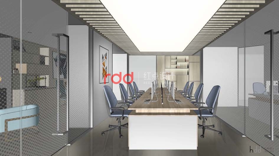 在平面設計上,采用直線型的設計手法,角落位置以柜式處理為主,大大的提高了空間的利用率;同時通過動區與靜區的空間劃分,把辦公跟會議及人流動線大的衛生間區分開來,降低了空間的噪音干擾。