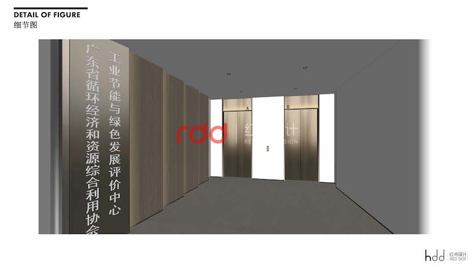 設計師利用“一空間多用的”的特點,把電梯間作為該單位的形象宣傳區域。進入電梯間,藍與綠雙環保型結構的logo在再生木背景墻的映襯下突出醒目,靠近門的區域使用層層跌級結構,與環保型logo相呼應。