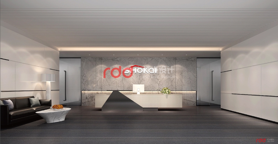 企業logo上面的坡屋頂和漢字“人”藝術演化而來,寓意著首開立足北京、放眼天下的格局。紅點裝飾的設計師根據logo的設計理念,前臺采用人字的設計,與企業logo不謀而合。兩邊簡潔的白色大理石在黑色不銹鋼收邊條的襯托下細節突出,烘托出背景墻這一中心焦點。