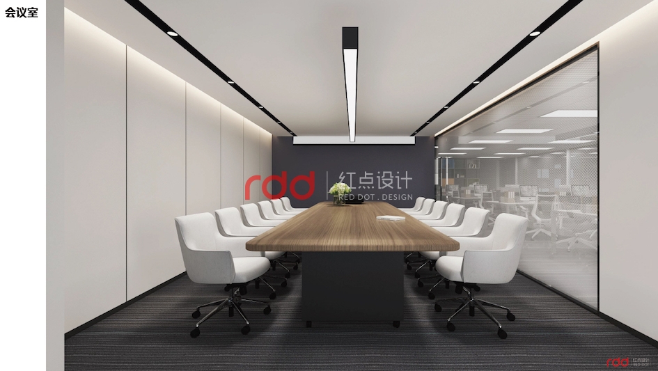 會議室由黑白兩個顏色組成,天花上黑色不銹鋼從門口處一直延伸到盡頭,燈光及家具按照同樣的方式延伸開來。