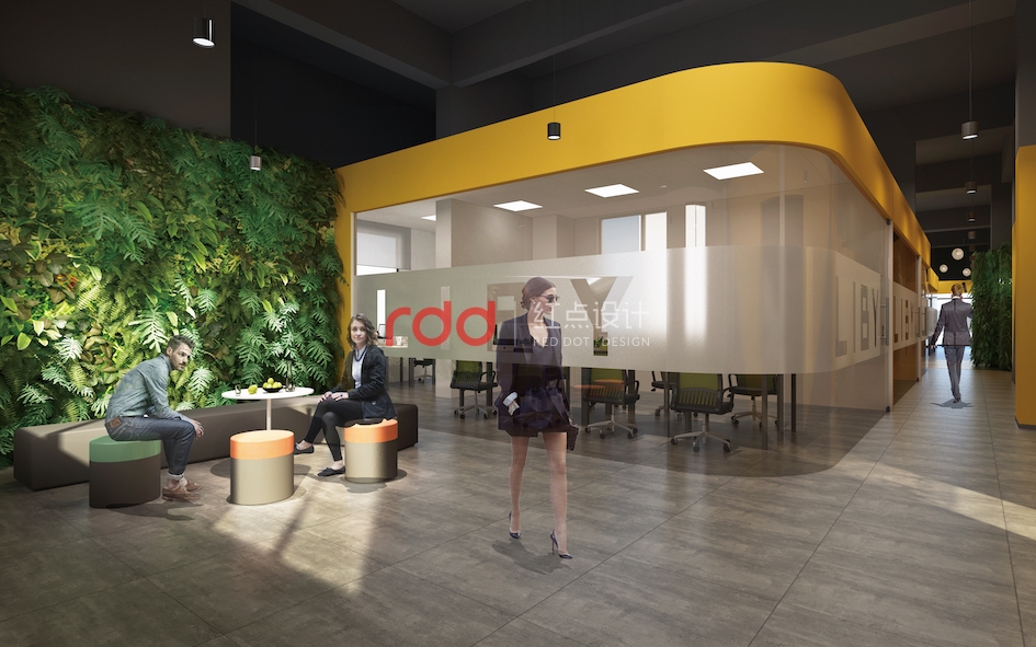 前臺休閑區是一個企業靈魂的體現,也是靈感迸發的地方。年輕活躍的氛圍是最好的藥引,因此在色彩的設計上,設計師大膽運用橙黃色,這一色調一致延伸到其他空間。