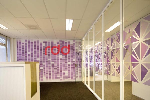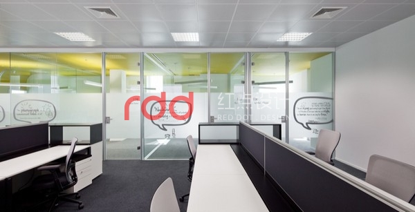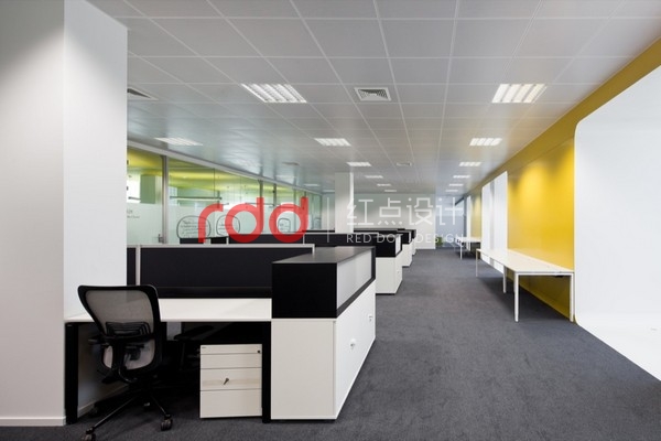 IT行業(yè)給人的印象是硬朗的,為了打破這樣的固定思維模式,紅點(diǎn)裝飾的設(shè)計(jì)師運(yùn)用黃色及紫色比較柔和的色彩來(lái)改變空間的氛圍。線條交錯(cuò)的白色鏤空隔斷圍合,形成相對(duì)獨(dú)立的空間。