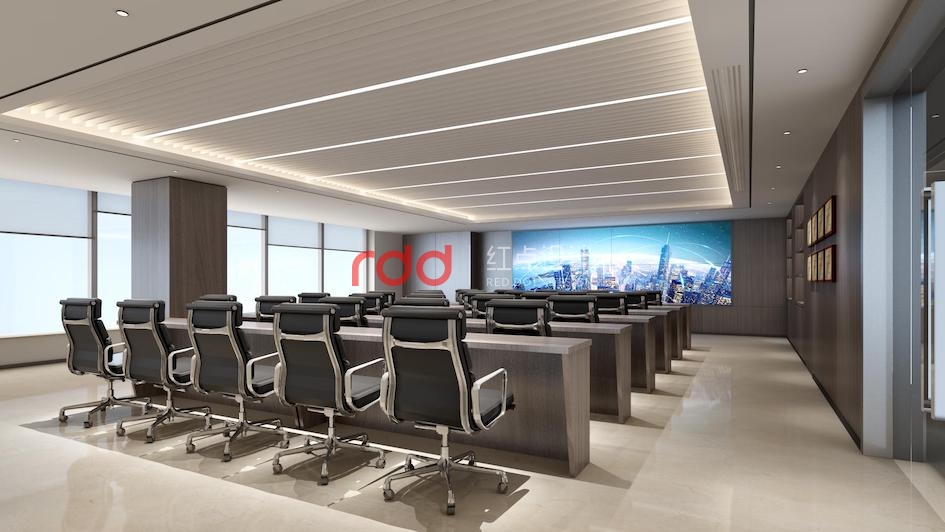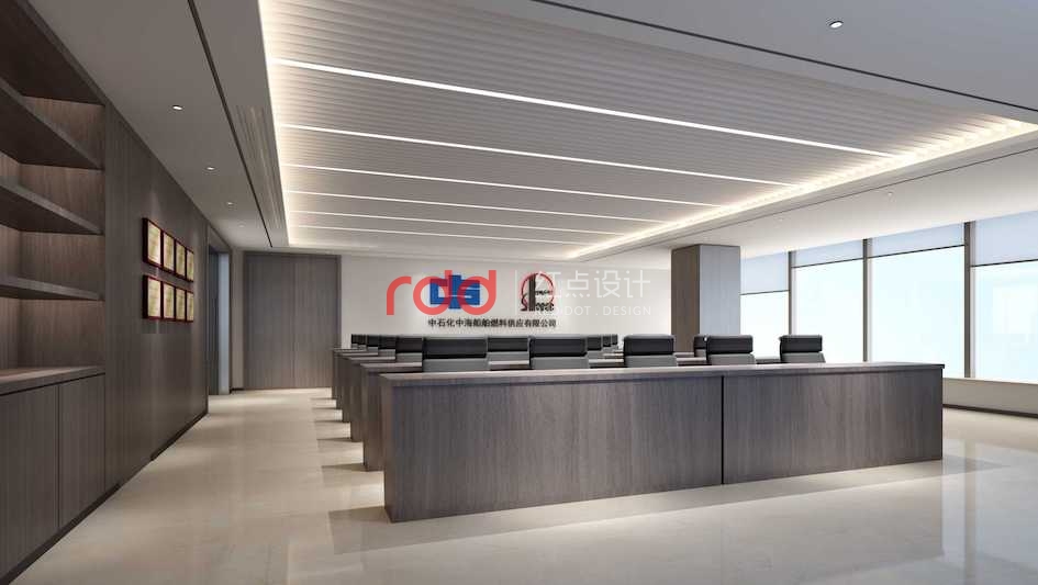 本案是裝修改造工程,會議室墻身及家具統(tǒng)用統(tǒng)一的深啡色木飾面,白色鋁格柵的造型天花。會議室后面中石化及中海兩個logo醒目地立在那里。