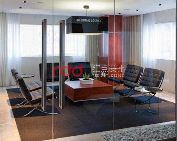 出于這樣一個原因,紅點裝飾的設計師以黑白及木色為主色調,設計上沒有過多的造型,每一個造型,每一堵墻,甚至每一條線都經過推敲。為了提升空間高大上的氣質,選用了高檔的家具,流線型的桌子,洽談室內還用了建筑大師密斯凡德羅的經典作品--巴塞羅那椅。
