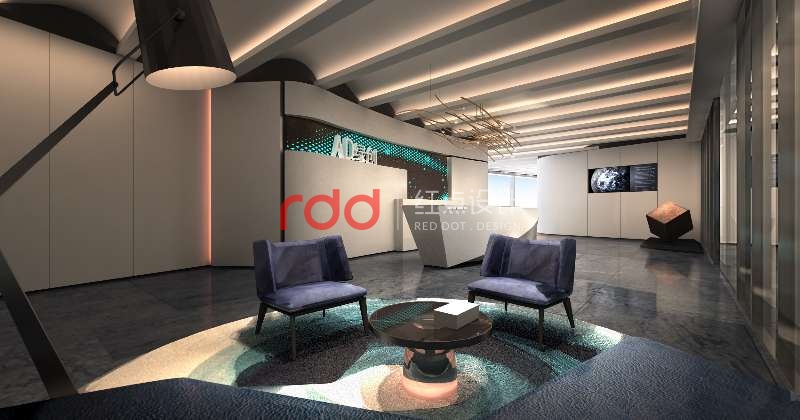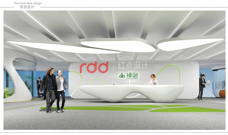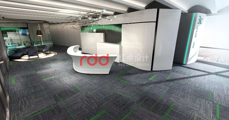 黑白灰是永恒不變的主題,加上綠創(chuàng)公司的LOGO色(綠色)為點(diǎn)綴色。本案紅點(diǎn)裝飾的設(shè)計(jì)師運(yùn)用構(gòu)成主義的手法,前臺(tái)背景利用正方體為基本元素,把不同大小的正方體組合在一起,中間利用穿孔鋁板噴成白色和綠色。地面鋪深灰色仿大理石磚,配上白色與灰色相間的造型前臺(tái),整個(gè)空間看起來沉穩(wěn)大方。
