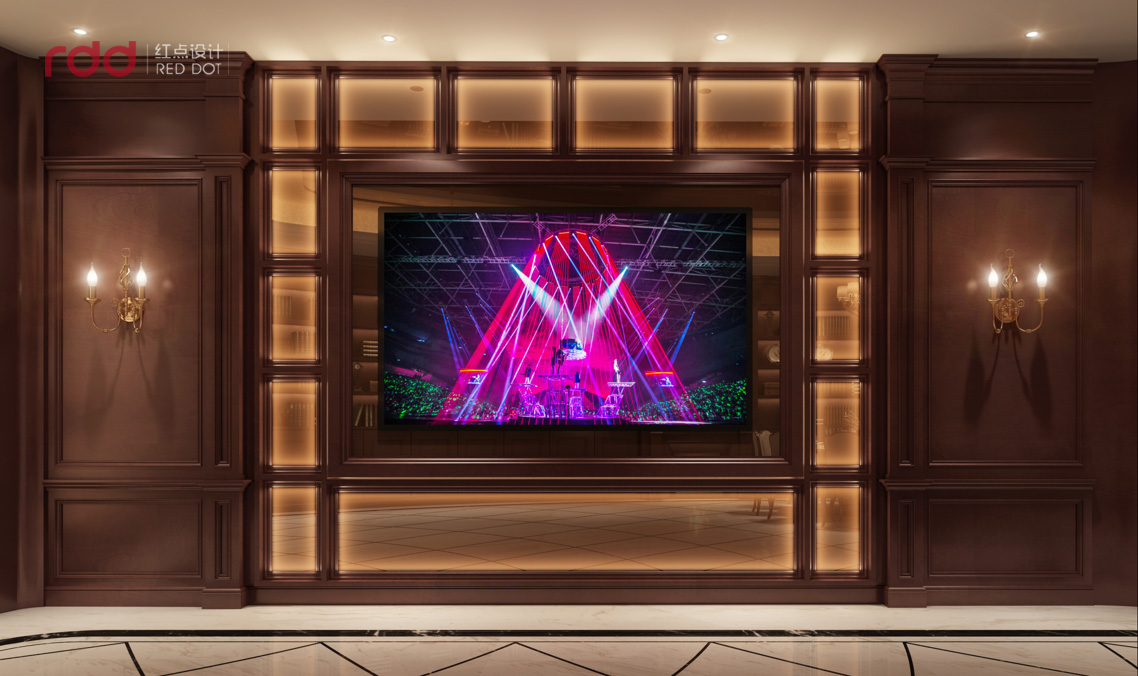 本項目由于是改造項目,所以要保持原有英倫風(fēng)格,立面上運用大量的咖啡色實木,紅色的英式風(fēng)格的墻紙,配上英式掛畫和英式的木質(zhì)及酒紅色的拉扣皮革沙發(fā),烘托出整個環(huán)境優(yōu)雅古典的氣氛。