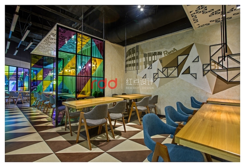 流光溢彩的外立面劃出一道弧線,配上多彩的玻璃窗像極一道炫目的虹。哪怕只是路過,驚鴻一瞥間也能讀出這里洋溢的別致、時尚與異域風情。通透度極高的彩色玻璃,如同眼下時髦的濾鏡,為空間染上了別樣繽紛。紅黃藍綠四色被現代主義手法所重構,隨機組合成了色彩鮮艷明麗的所在。設計師為該餐廳引入了不少電影元素,從門口的老舊放映機到內部的膠卷盤壁燈,復古的年代感就像大餐中的一小撮海鹽,于時光交錯間,將時尚與摩登烘托得淋漓盡致。