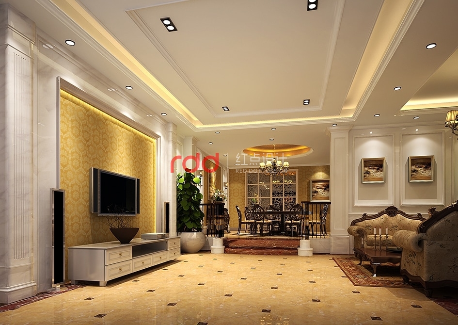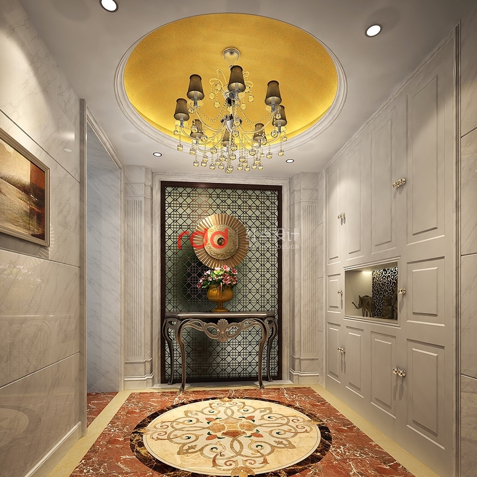 簡歐風格是時下住宅裝修流行的一種風格,這種風格個性鮮明,從簡單到復雜、從整體到局部,精雕細琢,給人一絲不茍的印象。入戶玄關白色的整體貴與墻身爵士白大理石形成對稱互補關系,簡歐的造型柱典雅大方,中間半透明的歐式花紋背景墻若隱若現,內噴金箔的圓形吊頂及地面圓形地花互相呼應。