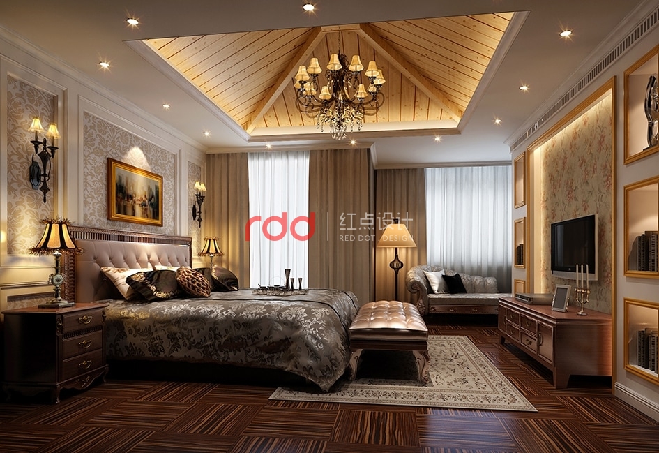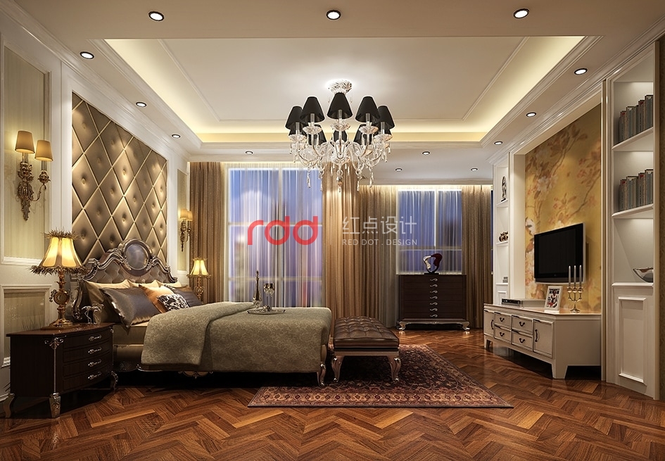 臥室空間內歐式花紋背景墻,金漆裝飾線條包邊電視柜,深色的木地板,加上高背軟包的歐式床,在暖光燈的散射下,溫馨舒適。