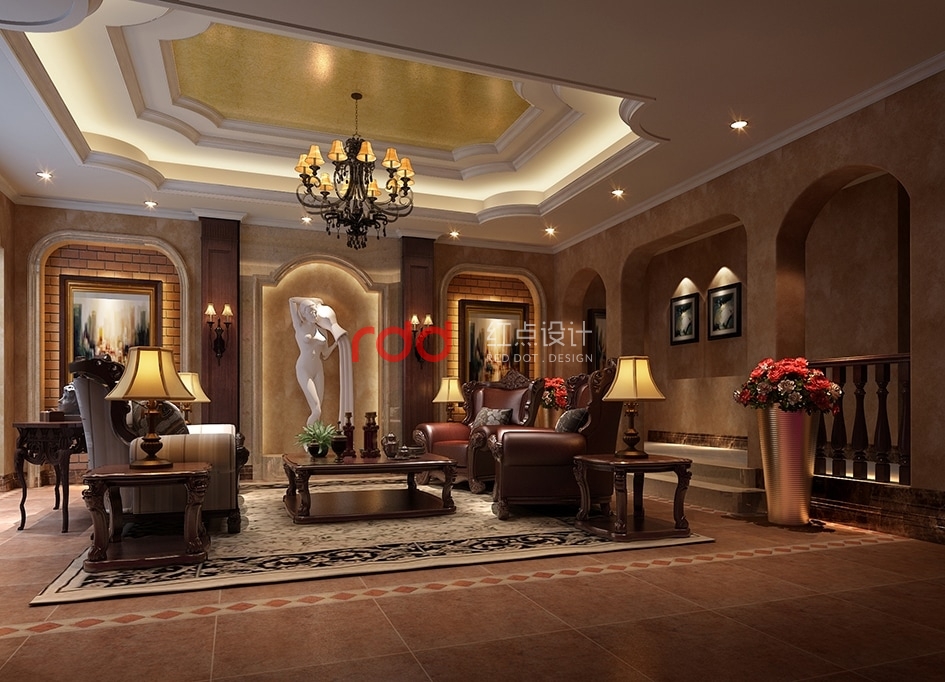 休閑廳有別于整體空間風格,以深色的皮質家具及深色的復古地磚為主,配合圓拱門洞,實木歐式造型欄桿,加上中間背景墻上經典的裝飾掛畫及雕塑,輕松舒適的氛圍的顯而易見。