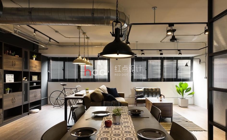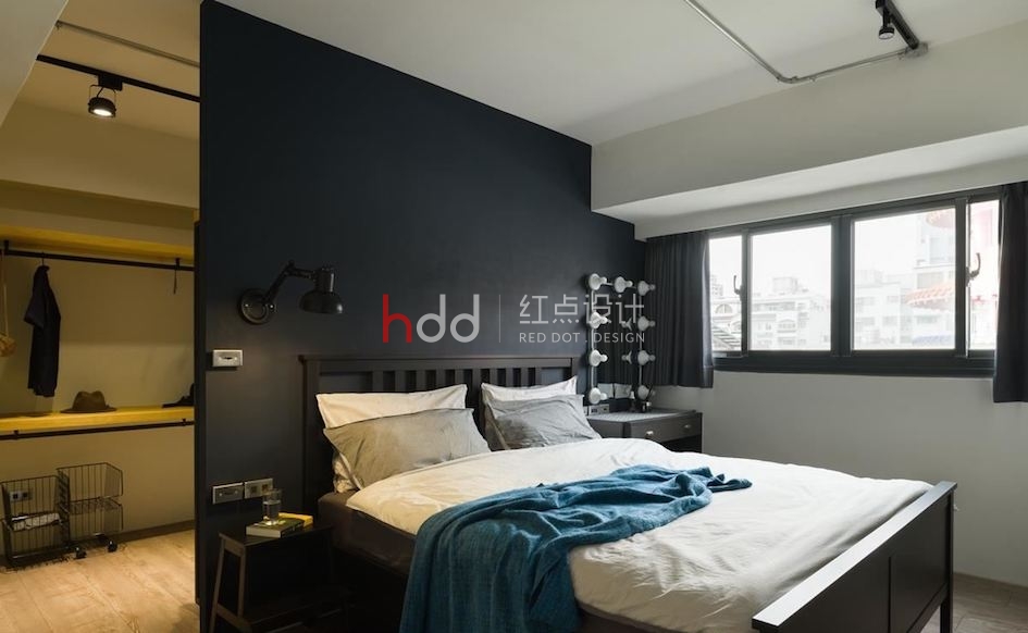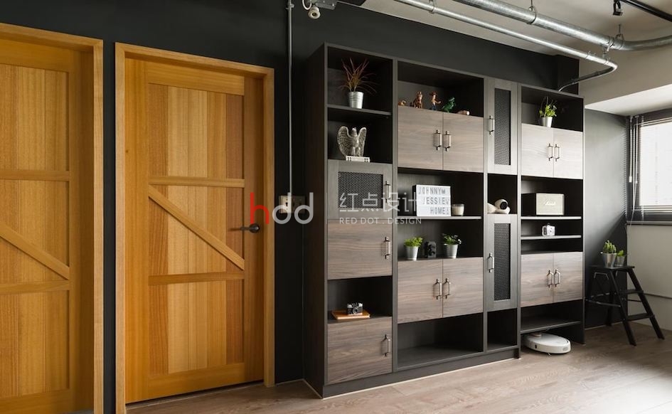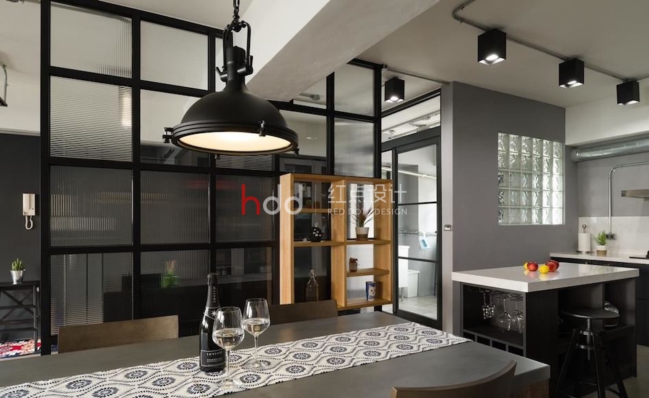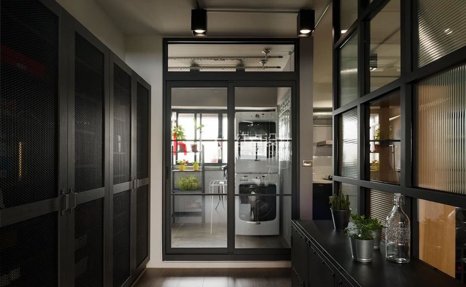 由于主人向往大坪數般的空間感受,也相當重視與親朋好友的歡聚時光,設計師以開放設計串連公領域,放大餐廚空間,并讓客廳與餐廚呈現至于同一水平,創造流暢的對話動線。入門處以回字玻璃屏隔搭配大面積柜體,創造通透且收納量充足的玄關。本案風格以美式工業風格為主軸,天花以裸露管路搭配軌道照明,整體色調更以藍黑油漆涂刷壁面,充分彰顯個性氣息。