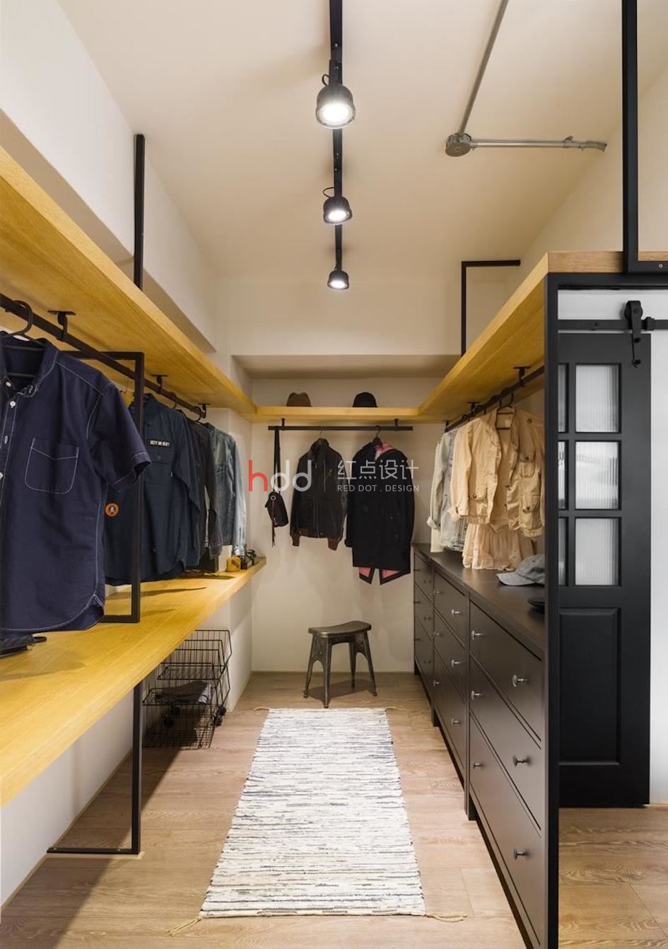 不僅如此,設計師利用工業風配件如皮件、鐵件燈飾、單椅與柜體、彷舊木質家具搭配木地板,成功營造經典與復古的平衡。 L 型廚房搭配中島吧臺,提升與用餐空間的互動頻率,讓歡聚時刻毫無隔閡、自宅宛如咖啡廳。 主臥延續公領域色彩,并在床頭后方規劃更衣間,以鐵件與木元素打造工業風收納,讓試裝時光也宛如身處個性服飾店。