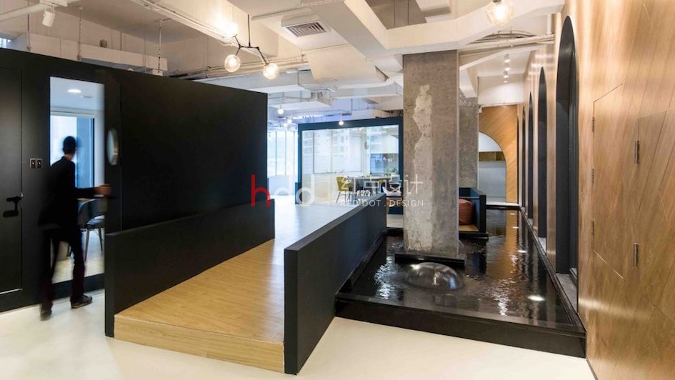 “蜻蜓島”是一個抬高平臺,由三間討論室和一個休閑沙龍組成。空間概念上是設(shè)計一個與周圍環(huán)境脫離的獨立體量,從而提供一個遠離辦公區(qū)的休閑場所。它被賦予了類似蜻蜓的平面造型,并放置在一個開放空間的水面上,從這個工業(yè)建筑框架主導(dǎo)的辦公空間中分離開來。被油漆成黑色的表面不表現(xiàn)任何材質(zhì)紋理,這種抽象性使它從周圍那些裸露的混凝土結(jié)構(gòu)柱以及木材質(zhì)感的景觀長墻等元素中獨立出來,獲得輕盈漂浮的放松感覺。家具和燈具也經(jīng)過精心挑選,一同營造這種休閑氛圍。