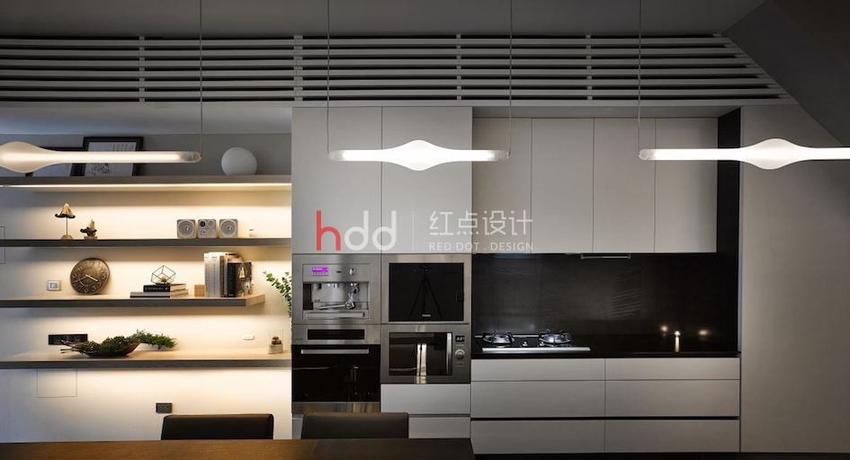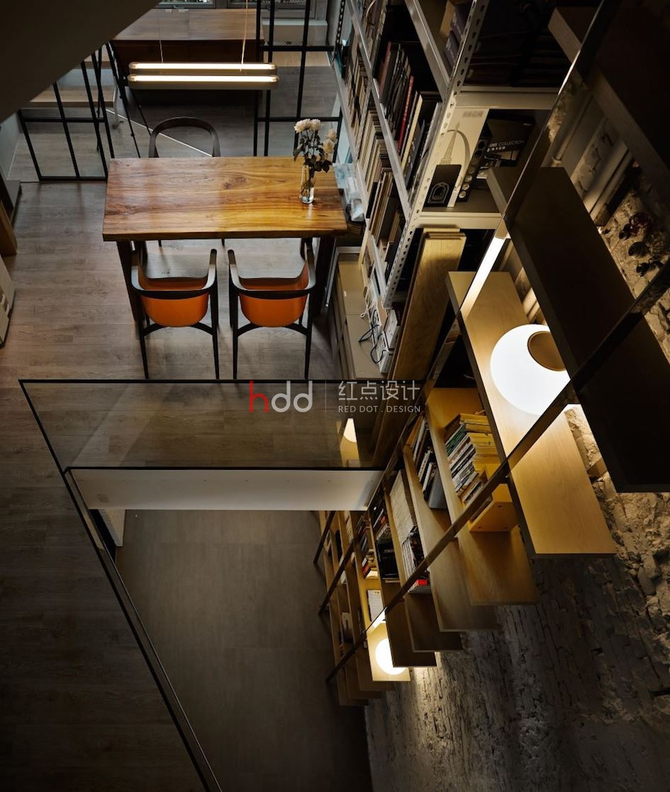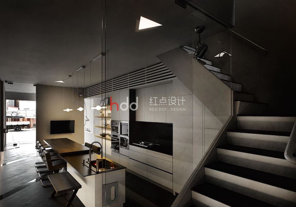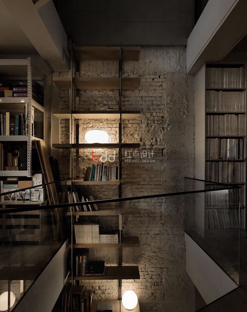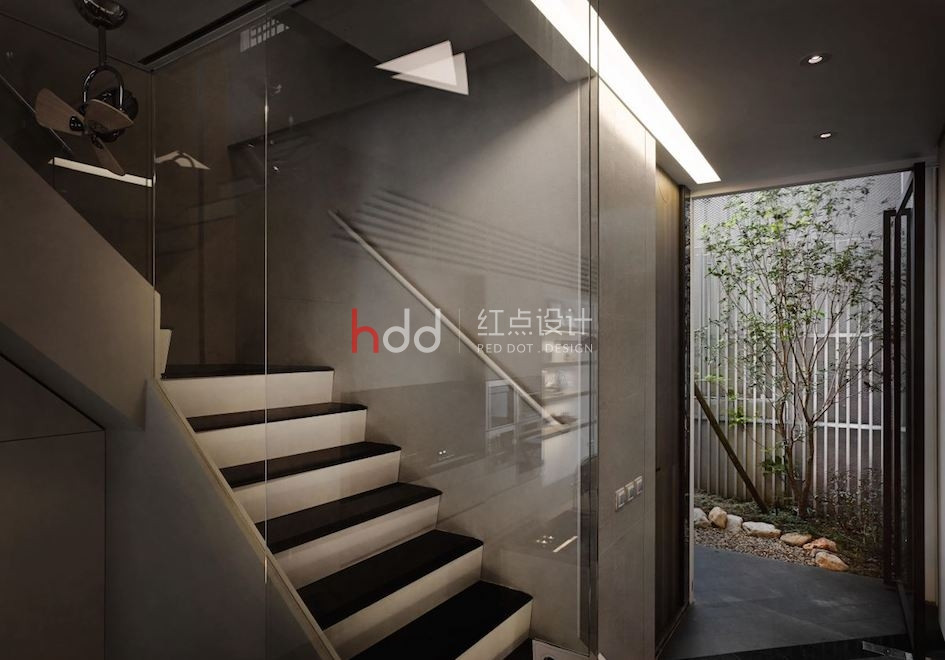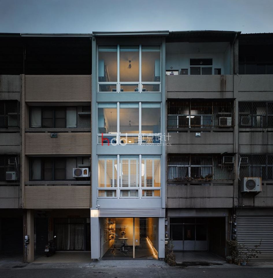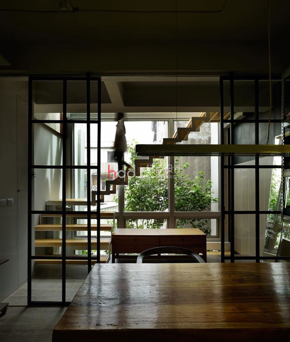 位于一整排房屋中段的透天厝,原本室內采光不佳,在設計師的改造下,透過前后的落地窗引注陽光,并在后院種植楓香樹,將設計辦公室與大自然的溫度嵌合連結,成為讓令人驚艷的社區地景。 來到這個獨特設計的辦公室,以純白為色彩主調,加入造型鐵件、玻璃等介質,在有序的工作空間中,將光線的進折,醞釀為藝術般的美好表現。從二樓處向上俯瞰,水泥量體和玻璃的幾何層次,于高挑的立面中虛實交迭,將樓層間連貫為一座自然光井,除了讓視覺顯得通透,空氣也可借此形成上下對流循環。通往三樓、四樓的階梯,倚著窗景綠意向上延伸,透過通透的玻璃介質,將原本封閉的梯間,則轉化為開放式的生活風景,一年四季為工作空間帶來不同的景致變化,與陽光、綠意、微風完美共生。 陽光自透明落地窗透入室內,仿佛伸手即可觸碰到窗邊的鮮活綠意,而隨著工作中的動態行走,也串連成一幅在樹梢間自在漫步的浪漫畫面。