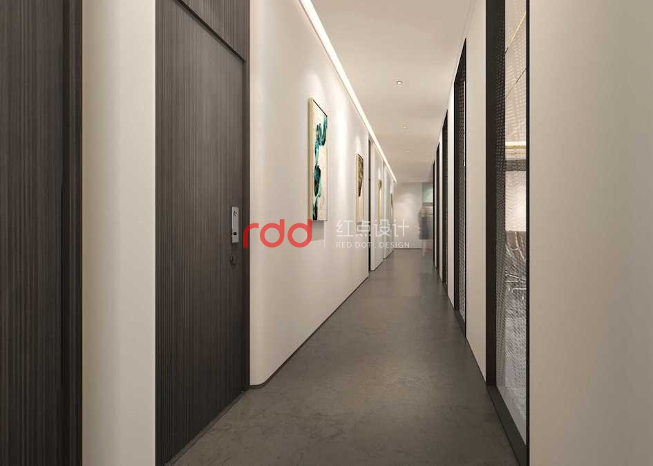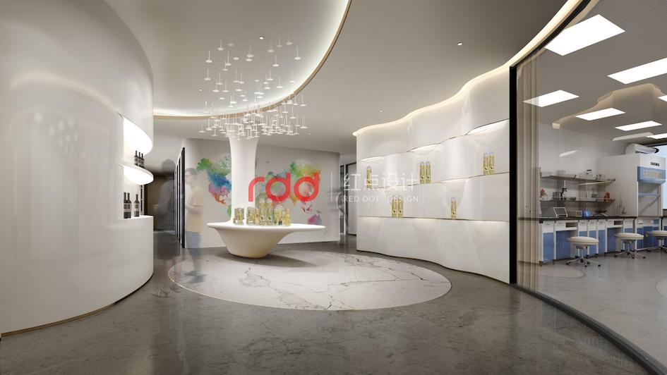 本案是企業(yè)是專注于SOD系列技術及相關產品。“SOD”酶是一種金屬酶,是氧自由基的自然天敵,是生命健康之本。前臺背景墻上發(fā)光金屬logo“SOD”三個字簡單明了。白色的弧形背景墻與弧形前臺相互呼應。