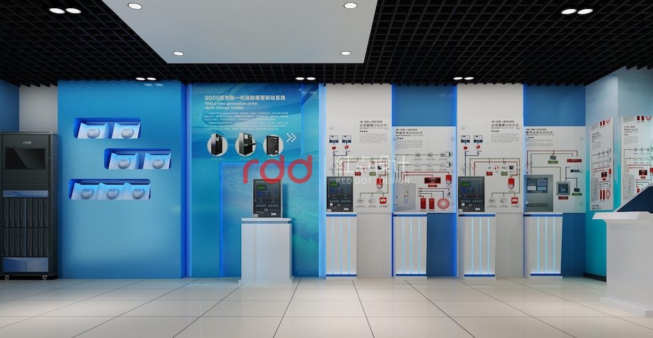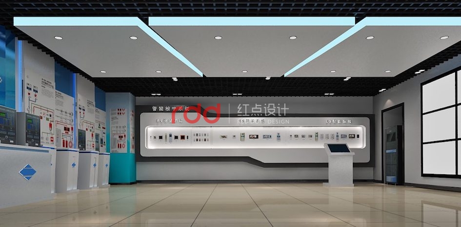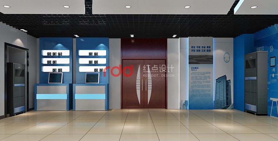 針對該公司從事的產(chǎn)品及業(yè)務(wù)情況,紅點裝飾的設(shè)計師,根據(jù)與客戶溝通后的情況,以藍色為主色調(diào),產(chǎn)品尺寸及參觀動線設(shè)計展廳的參觀流程。